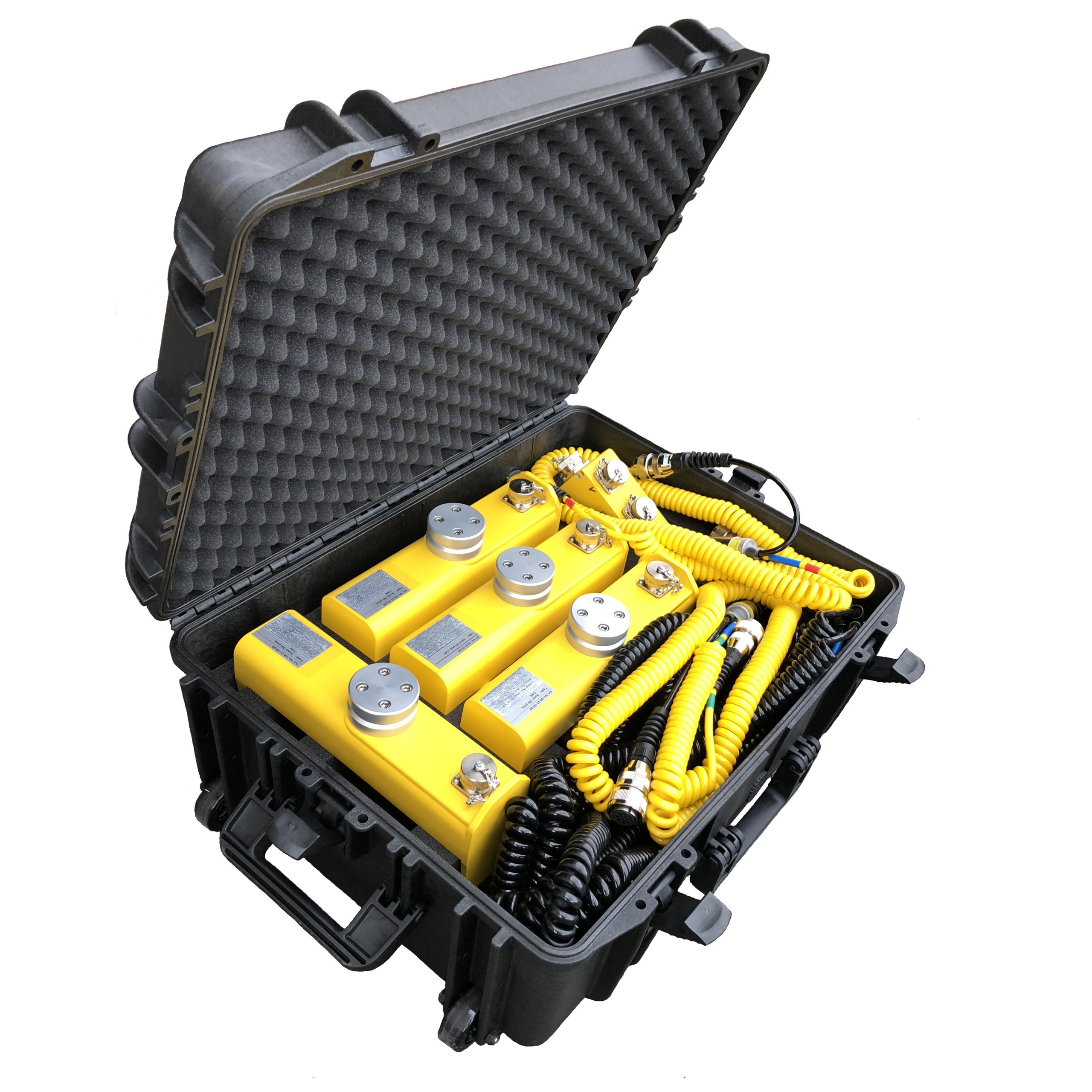 Comprenant 4 skis avec télécommande, boitier de jonction, câbles et valise renforcée étanche sur roulettes.